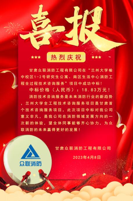 消防技术咨询服务是未来消防行业的新趋势兰州大学全工程技术咨询服务项目是甘肃首个技术咨询服务项目,此次项目中标对我公司意义非凡,是我公司在消防领域发展方向的一次新的体验,望全体同事能够齐心协力,为乐天堂fun88消防的未来赢得更好的发展!